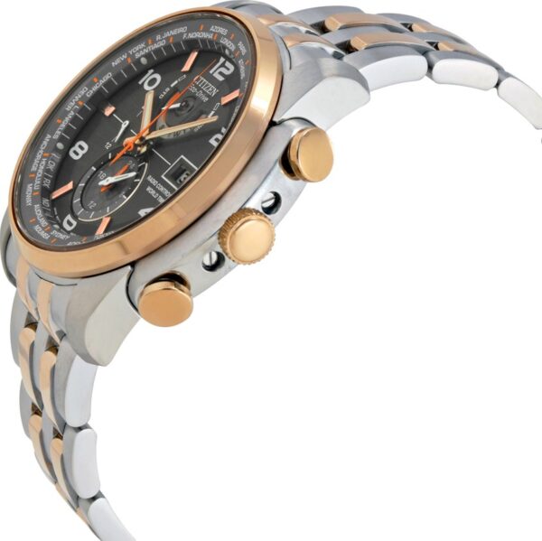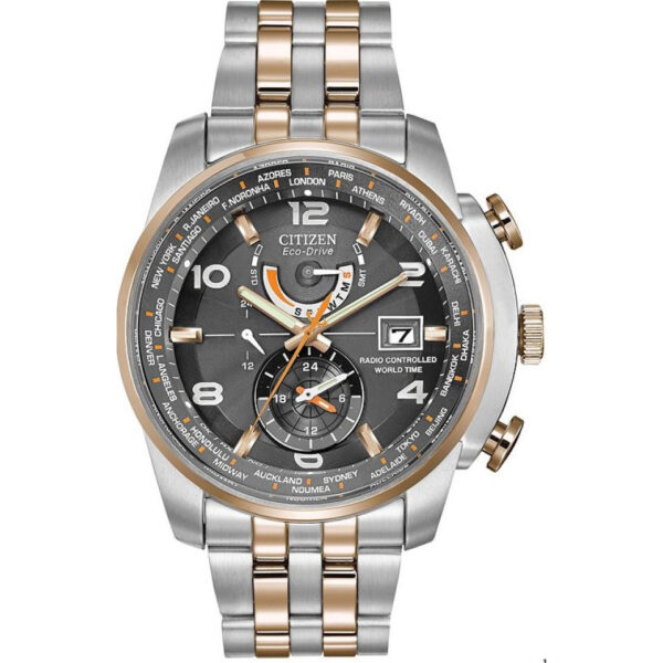 Táo bạo, mạnh mẽ và đa chiều, Citizen Eco-Drive giới thiệu chiếc đồng hồ mới nhất của mình với chức năng chấm công nguyên tử. Với tính năng đồng bộ hóa Đồng hồ nguyên tử cho độ chính xác vượt trội, lịch vạn niên này lưu giữ thời gian ở 26 múi giờ. Bằng thép không gỉ hai tông màu vàng hồng, mặt số màu trắng và các điểm nhấn màu cam trên mặt số.