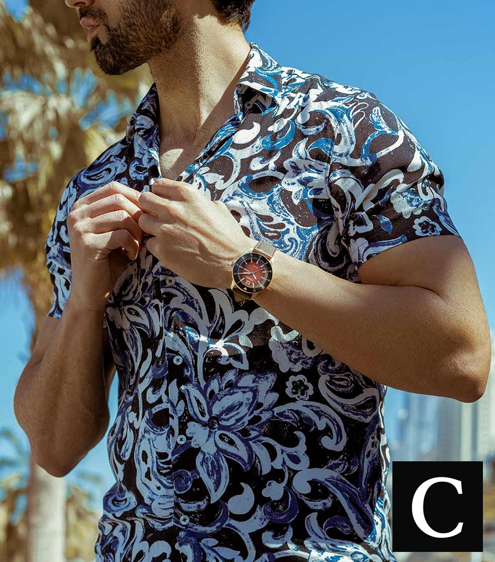 Vỏ thép không gỉ tông vàng hồng với dây đeo bằng da màu nâu. Viền thép không gỉ tông vàng hồng cố định với một vòng dát màu đen. Mặt số màu cam với kim màu vàng hồng sáng và vạch chỉ giờ. Chữ số Ả Rập xuất hiện ở vị trí 12 giờ. Điểm đánh dấu phút xung quanh vành ngoài. Loại quay số: Analog. Bàn tay và điểm đánh dấu phát quang. Hiển thị thứ trong tuần và ngày ở vị trí 3 giờ. Bộ chuyển động sinh thái J800. Tinh thể khoáng chống trầy xước. Kéo/đẩy vương miện. Vỏ sau chắc chắn. Kiểu dáng vỏ tròn, kích thước vỏ: 43,5 mm, độ dày vỏ: 12 mm. Chiều rộng dải: 20 mm. Tang kẹp. Chống nước ở độ sâu 100 mét / 330 feet.