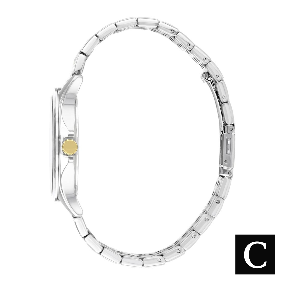 Vỏ thép không gỉ với dây đeo bằng thép không gỉ hai tông màu (tông màu bạc và tông màu vàng). Vành thép không gỉ cố định. Mặt số màu xanh lam với kim màu vàng phát sáng và số La Mã xen kẽ và các vạch chỉ giờ. Vạch chỉ phút xung quanh vành ngoài. Kiểu mặt số: Analog. Kim phát sáng. Hiển thị ngày và thứ trong tuần ở vị trí 3 giờ. Bộ máy thạch anh Citizen calibre 1502. Tinh thể khoáng chống xước. Núm điều chỉnh kéo / đẩy. Nắp lưng chắc chắn. Hình dạng vỏ tròn. Kích thước vỏ: 41 mm. Độ dày vỏ: 9 mm. Chiều rộng dây đeo: 21 mm. Khóa gập có nút nhấn nhả. Chống nước ở độ sâu 50 mét / 165 feet. Chức năng: ngày, thứ, giờ, phút, giây. Kiểu đồng hồ thường ngày. Nhãn đồng hồ: Japan Movt.