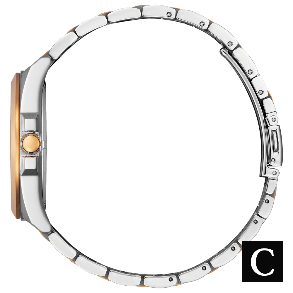 Vỏ thép không gỉ tông màu bạc với dây đeo bằng thép không gỉ hai tông màu (tông màu bạc và tông màu vàng hồng). Vành thép không gỉ cố định tông màu vàng hồng. Mặt số màu đen với kim và vạch chỉ giờ tông màu vàng hồng phát sáng. Vạch chỉ phút bằng số Ả Rập (cách nhau 5 phút). Vạch chỉ phút xung quanh vành ngoài. Kiểu mặt số: Analog. Kim và vạch chỉ giờ phát sáng. Hiển thị ngày ở vị trí 3 giờ. Bộ máy Eco-drive. Mặt kính sapphire chống trầy xước. Núm điều chỉnh kéo / đẩy. Nắp lưng chắc chắn. Hình dạng vỏ tròn, kích thước vỏ: 41 mm. Chiều rộng dây đeo: 22 mm. Khóa gập có nút nhấn nhả. Chống nước ở độ sâu 100 mét / 330 feet. Chức năng: ngày, giờ, phút, giây. Dòng Peyten. Kiểu đồng hồ thường ngày. Nhãn đồng hồ: Japan Movt.