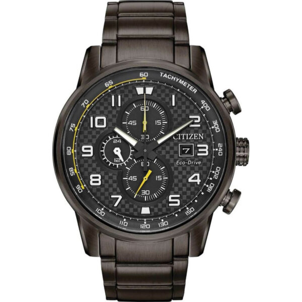 Đã đến lúc bắt đầu cuộc đua với chiếc CITIZEN Primo Chronograph mới và cải tiến với công nghệ Eco-Drive. Một chiếc đồng hồ theo kịp lối sống tốc độ của bạn, được minh họa ở đây với vỏ và vòng đeo tay bằng thép không gỉ mạ ion màu xám dành cho nam giới với mặt số màu đen tuyền với các điểm nhấn màu vàng sáng. Đồng hồ bấm giờ 1/5 giây với thời gian và ngày 12/24 giờ. Số cỡ nòng B612.