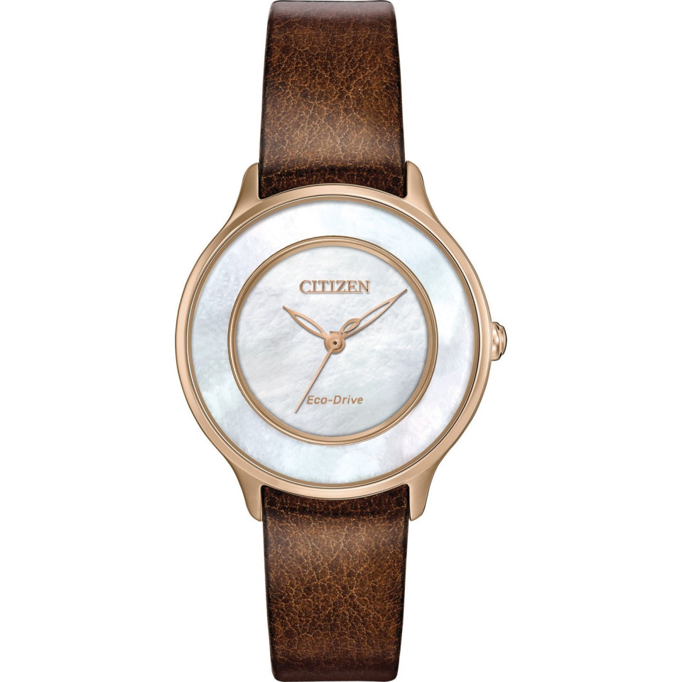 Đồng hồ Circle of Time hội tụ tất cả phong cách và sự tinh tế của dòng Citizen L. Nổi bật ở đây là vỏ thép không gỉ tông vàng hồng, dây đeo bằng sáng chế bằng da tổng hợp bằng đồng ngọc trai với mặt số xà cừ màu trắng và mặt kính sapphire.