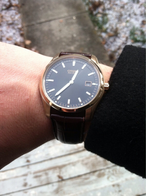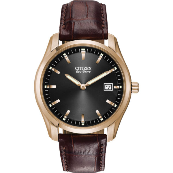 Một chiếc đồng hồ như thế này cho thấy bạn là người kinh doanh. Được chế tác bằng thép không gỉ tông vàng hồng với mặt số màu đen, kim dạ quang, chỉ báo ngày và dây đeo bằng da màu nâu tinh xảo.