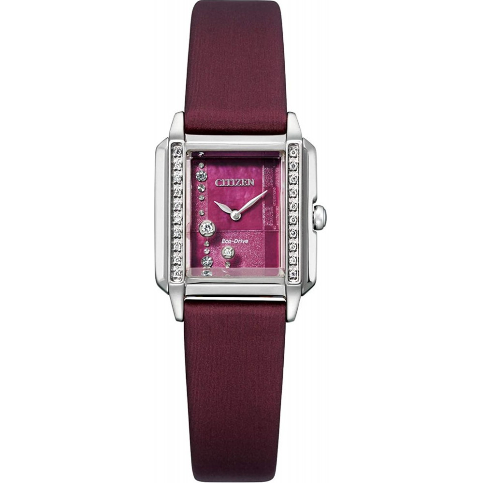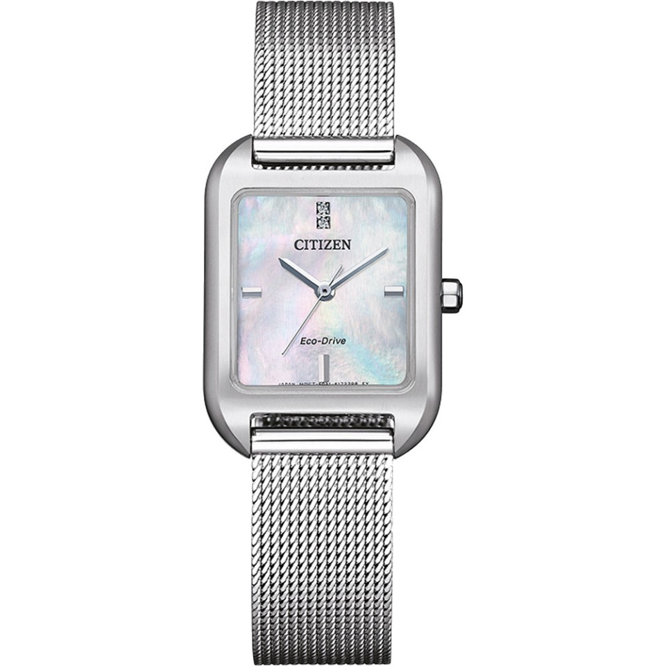 Vỏ thép không gỉ tông màu bạc với dây đeo bằng lưới thép không gỉ tông màu bạc. Vành thép không gỉ tông màu bạc cố định. Mặt số xà cừ với kim và vạch chỉ giờ tông màu bạc. Kiểu mặt số Analog. Bộ máy Citizen Caliber Eco-Drive E031 eco-drive. Tinh thể khoáng chống xước. Núm điều chỉnh kéo/đẩy. Mặt sau vỏ chắc chắn. Hình dạng vỏ vuông, kích thước vỏ 23,5 mm, độ dày vỏ 7,5 mm. Khóa cài nút nhấn. Chức năng giờ, phút, giây, năng lượng mặt trời. Bộ thông tin bổ sung với hai tinh thể ở vị trí 12 giờ. Kiểu đồng hồ đeo tay. Đồng hồ nữ Citizen Eco-Drive mặt xà cừ.