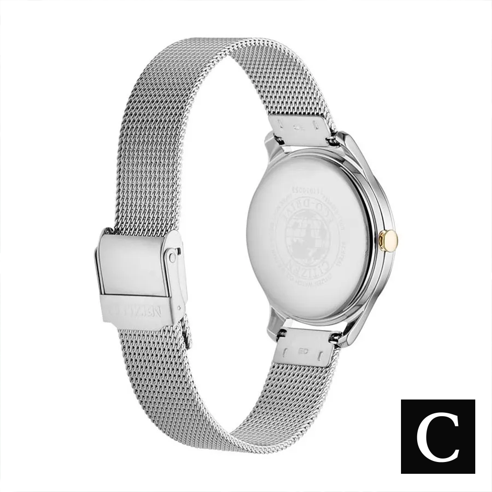 Vỏ thép không gỉ với dây đeo bằng lưới thép không gỉ. Vành thép không gỉ cố định với vòng tông vàng. Mặt số màu trắng với kim và vạch chỉ giờ tông vàng. Vạch chỉ phút xung quanh vành ngoài. Loại mặt số: Analog. Bộ máy Citizen caliber E031 eco-drive. Tinh thể khoáng chống xước. Núm điều chỉnh kéo/đẩy. Nắp lưng vỏ chắc chắn. Hình dạng vỏ tròn. Kích thước vỏ: 32 mm. Độ dày vỏ: 7,3 mm. Chiều rộng dây đeo: 14 mm. Khóa gập dạng trượt. Chống nước ở độ sâu 50 mét / 165 feet. Chức năng: giờ, phút, giây. Kiểu đồng hồ đeo tay. Nhãn đồng hồ: Japan Movt.