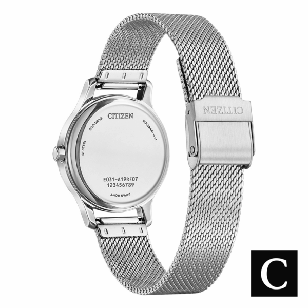 Vỏ thép không gỉ tông màu bạc với dây đeo bằng lưới thép không gỉ tông màu bạc. Vành thép không gỉ tông màu bạc cố định. Mặt số màu trắng với kim màu bạc và vạch chỉ giờ bằng số La Mã. Số La Mã đánh dấu vị trí 6 và 12 giờ. Vạch chỉ phút xung quanh vành ngoài. Loại mặt số: Analog. Bộ máy Citizen Caliber Eco-Drive E031 eco-drive. Tinh thể khoáng chống xước. Núm điều chỉnh kéo / đẩy. Nắp lưng vỏ chắc chắn. Hình dạng vỏ tròn, kích thước vỏ: 30,5 mm, độ dày vỏ: 8,2 mm. Chống nước ở độ sâu 50 mét / 165 feet. Chức năng: giờ, phút, giây, năng lượng mặt trời. Kiểu đồng hồ trang trọng. Nhãn đồng hồ: Japan Movt.