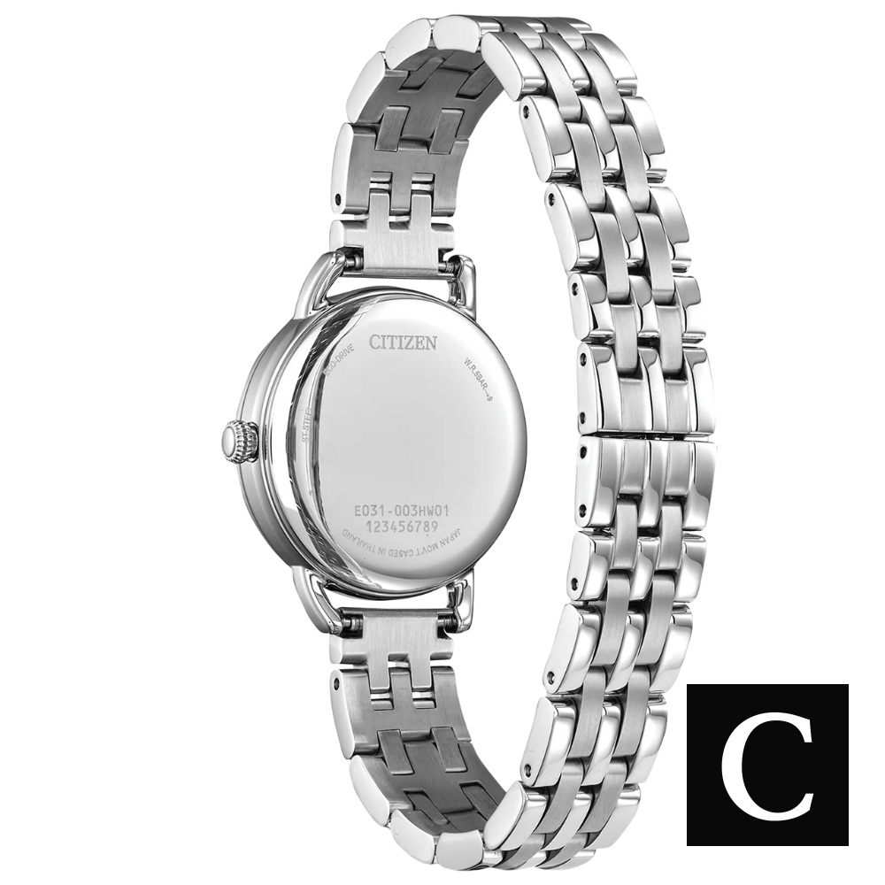 Một nét hiện đại trên thiết kế cổ điển. Với vỏ tông bạc thanh lịch có gờ có họa tiết, cạnh đồng xu và mặt số 3 kim tông bạc với số La Mã đậm, chiếc đồng hồ bóng bẩy này nổi bật giữa đám đông nhưng vẫn giữ được nét kín đáo. Khóa gập bằng thép không gỉ tông bạc giúp chiếc đồng hồ này có vẻ ngoài tối giản. Được cung cấp năng lượng bền vững bằng ánh sáng với công nghệ Eco-Drive, chiếc đồng hồ này không bao giờ cần pin và mang đến vẻ ngoài tinh tế cùng cảm giác cao cấp. Công nghệ chuyển động E031 Eco-Drive Được cung cấp năng lượng bởi bất kỳ nguồn sáng nào, liên tục và bền vững, loại bỏ nhu cầu thay pin đồng hồ. Chiều rộng vỏ (mm) 29. Chiều rộng càng (mm) 12. Loại dây đeo Dây đeo Thép không gỉ Chất liệu vỏ. Thép không gỉ tông bạc. Pha lê tinh thể khoáng. Chống va đập và vỡ. Khóa Khóa gập có nút bấm. Mặt số tông bạc. Chống nước WR50/5Bar/166ft [Bơi trong nước tĩnh]. Chức năng bổ sung 3 kim