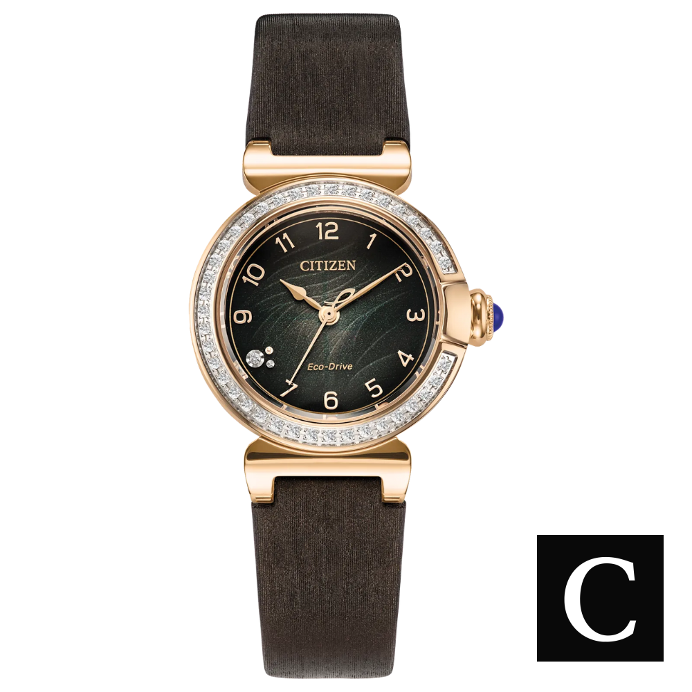 Những đường nét cổ điển và chút lãng mạn đã tạo nên chiếc đồng hồ mới nhất trong bộ sưu tập dành cho nữ của chúng tôi, Citizen L Mae, một sự bổ sung quyến rũ cho vẻ đẹp sang trọng bền vững. Với thiết kế vỏ 26mm lấy cảm hứng từ chai nước hoa cổ điển và nổi bật với những đường cong thanh mảnh của chuông tháng Năm, vành bezel đính kim cương tạo nên điểm nhấn đặc biệt tại vị trí 3 giờ, nơi núm điều chỉnh trông giống như một nút chặn nước hoa thanh lịch. Với mặt số màu xanh lá cây chuyển sắc được làm từ vật liệu tái chế, bao gồm đế polycarbonate tái chế bên dưới mặt số, màn hình được thể hiện qua vỏ và dây đeo bằng thép không gỉ màu vàng hồng bóng bẩy. Mặt số cũng được đính một viên kim cương làm điểm nhấn tại vị trí 8 giờ và được hoàn thiện bằng tinh thể sapphire. Được cung cấp năng lượng bền vững từ bất kỳ nguồn sáng nào với công nghệ Eco-Drive độc quyền của chúng tôi, không bao giờ cần pin, chiếc đồng hồ nữ thanh lịch này là một vẻ ngoài hoàn hảo với hiệu suất mạnh mẽ và đi kèm hộp đựng với dây đeo bằng da màu nâu có thể thay đổi. Calibre E031. Công nghệ chuyển động E031. Eco-Drive Được cung cấp năng lượng bởi bất kỳ nguồn sáng nào, liên tục và bền vững, loại bỏ nhu cầu thay pin đồng hồ. Chiều rộng vỏ (mm) 26. Loại dây đeo: Dây đeo bằng thép không gỉ. Chất liệu vỏ: Thép không gỉ tông vàng hồng. Pha lê. Pha lê Sapphire hình cầu. Khả năng chống trầy xước và độ cứng vượt trội. Pha lê hình cầu nổi lên trong vành bezel. Khóa: Khóa cài có nút bấm. Mặt số màu xanh lá cây. Khả năng chống nước WR50/5Bar/166ft. Chức năng bổ sung 3 Ha