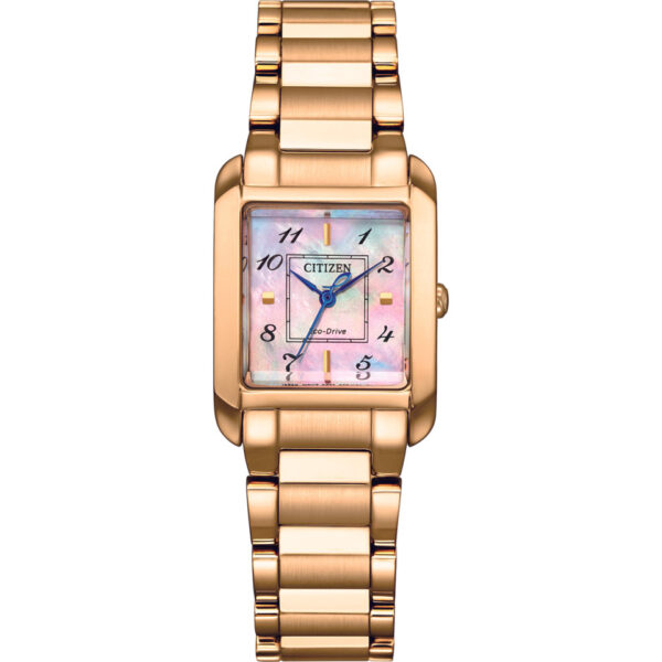 Vỏ và dây đeo bằng thép không gỉ tông vàng hồng. Vành thép không gỉ tông vàng hồng cố định. Mặt số xà cừ với kim màu xanh lam và vạch chỉ giờ bằng số Ả Rập. Loại mặt số: Analog. Bộ máy Citizen Caliber B035 eco-drive. Mặt kính sapphire chống xước. Núm điều chỉnh kéo/đẩy. Nắp lưng chắc chắn. Hình dạng vỏ hình chữ nhật, kích thước vỏ: 21,5 mm, độ dày vỏ: 7,5 mm. Khóa bướm. Chống nước ở độ sâu 50 mét / 165 feet. Chức năng: giờ, phút, giây. = Series. Kiểu đồng hồ đeo tay. Nhãn đồng hồ: Japan Movt.