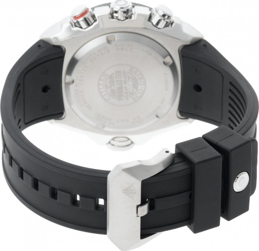 - Có cửa sổ quay số bằng pha lê khoáng bảo vệ, cửa sổ ngày, mặt số phụ đồng hồ bấm giờ, núm vặn và nút bấm bắt vít, khung bezel một chiều và khóa đóng