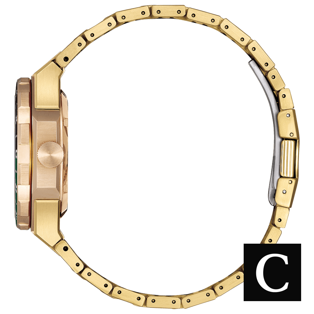 Vỏ và dây đeo bằng thép không gỉ tông vàng. Vành bezel bằng thép không gỉ màu xanh lá cây và đen xoay hai chiều. Mặt số màu đen với kim và vạch chỉ giờ tông vàng. Vạch chỉ phút xung quanh vành ngoài. Kiểu mặt số: Analog. Kim và vạch chỉ giờ phát quang. Hiển thị ngày ở vị trí 3 giờ. Bộ máy tự động Citizen Calibre 9054 với khả năng dự trữ năng lượng 50 giờ. Mặt kính sapphire chống trầy xước. Mặt sau trong suốt, có thể nhìn xuyên qua. Hình dạng vỏ tròn, kích thước vỏ: 41 mm. Khóa gập có chốt an toàn. Chống nước ở độ sâu 100 mét / 330 feet. Chức năng: GMT, múi giờ thứ hai, ngày, giờ, phút, giây. Series8 880 Series. Kiểu đồng hồ thể thao. Nhãn đồng hồ: Japan Movt. Citizen Series8 880 GMT Automatic.
