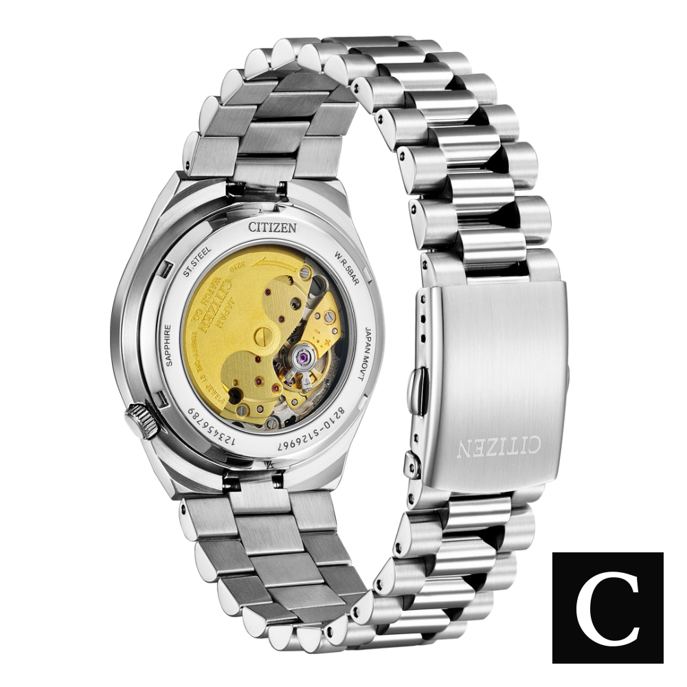 Vỏ và dây đeo bằng thép không gỉ tông màu bạc. Vành thép không gỉ tông màu bạc cố định. Mặt số màu đen với kim và vạch chỉ giờ tông màu bạc. Vạch chỉ phút xung quanh vành ngoài. Kiểu mặt số: Analog. Kim và vạch chỉ giờ phát quang. Hiển thị ngày ở vị trí 3 giờ. Bộ máy Citizen Calibre 8210 Automatic, chứa 21 Chân kính, hoạt động ở tần số 21600 vph và có khả năng dự trữ năng lượng khoảng 40 giờ. Kính sapphire chống xước. Núm điều chỉnh kéo / đẩy. Mặt sau trong suốt. Hình dạng vỏ tròn, kích thước vỏ: 40 mm, độ dày vỏ: 11,7 mm. Khóa gập có chốt an toàn. Chống nước ở độ sâu 50 mét / 165 feet. Chức năng: ngày, giờ, phút, giây. Dòng Tsuyosa. Kiểu đồng hồ thường ngày. Nhãn đồng hồ: Japan Movt.