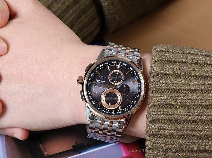Citizen World Chronograph AT, chiếc đồng hồ lý tưởng cho những người đam mê du lịch thế giới. Máy chấm công nguyên tử ở 26 múi giờ, đồng hồ bấm giờ 1/20 giây đo tối đa 60 phút, lịch vạn niên, thời gian 12/24 giờ, chỉ báo dự trữ năng lượng, ngày và thứ. Được chế tác bằng vỏ và vòng đeo tay bằng thép không gỉ hai tông màu vàng hồng với mặt số màu đen nổi bật với các điểm nhấn tông màu vàng hồng và mặt kính sapphire.